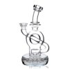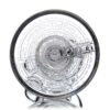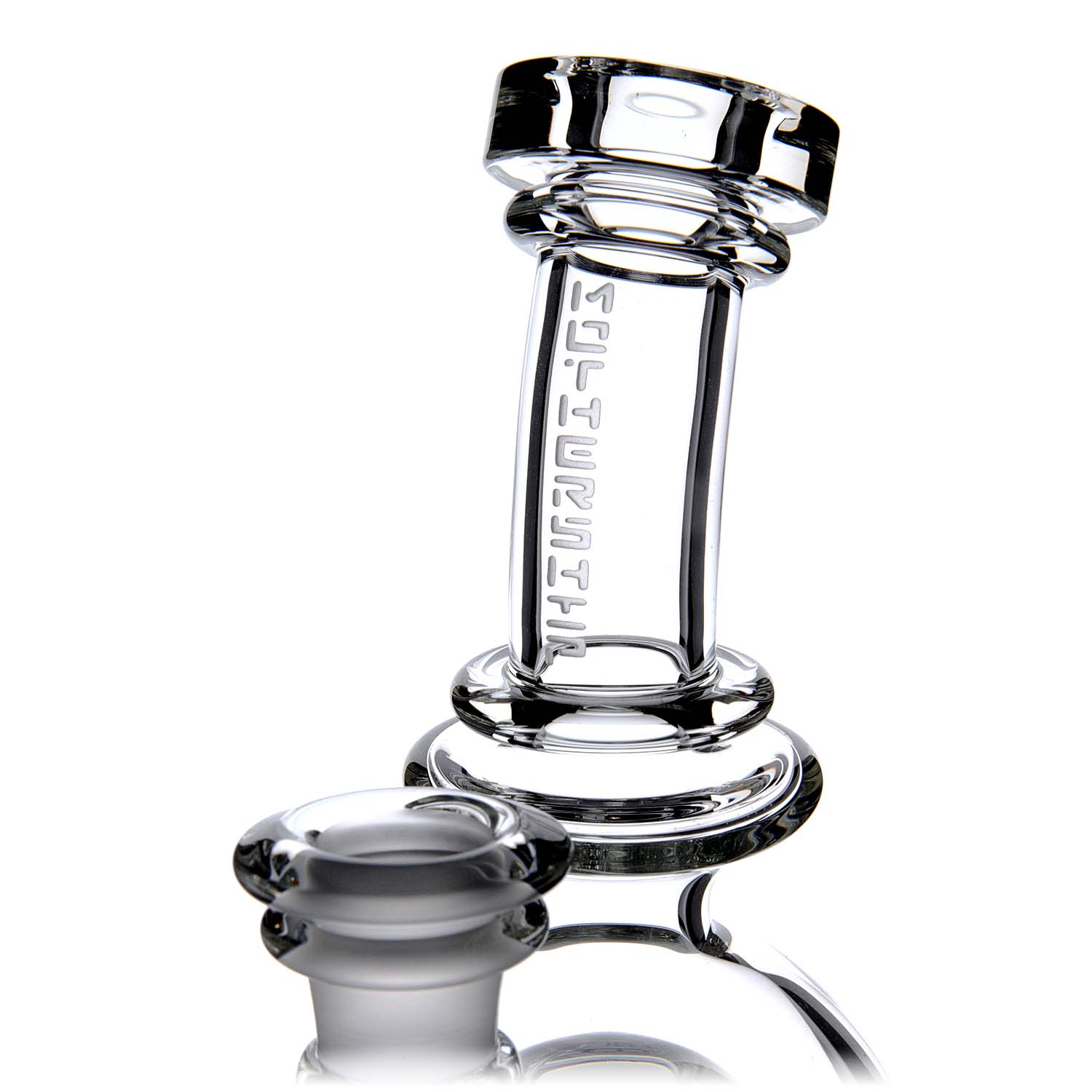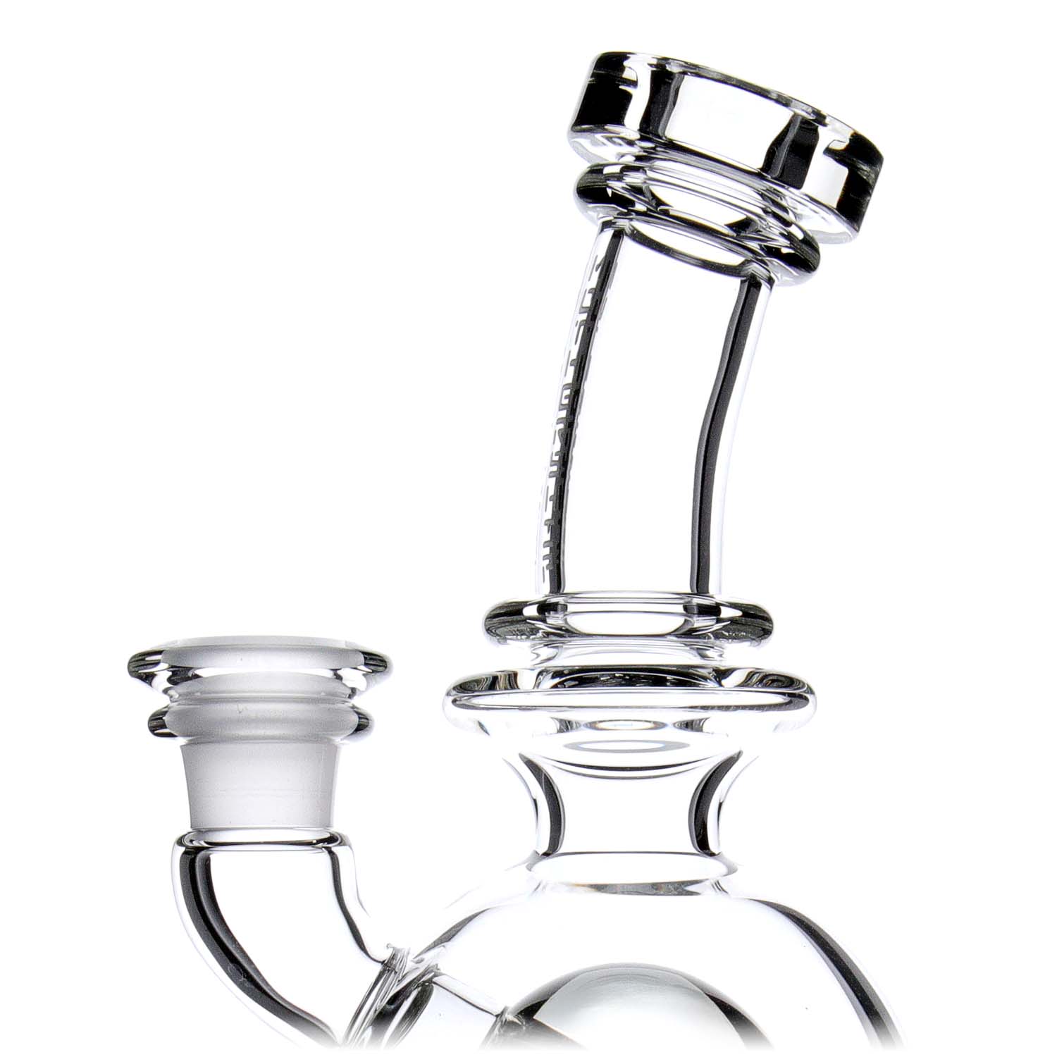 Vapor is transported through the inner solid glass sphere, passing below the waves held by the outer globe, before navigating the percolating water. The Ball Rig has either a single seed or flower of life perc system and comes in three sizes: Micro, Mini, and Full Size.